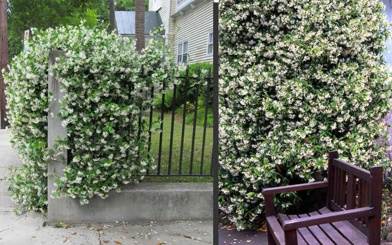 With vines growing 10 feet or more long and 2 to 4 feet wide, Confederate Jasmine is an ideal selection for use to climb along the top of fences, on a trellis, on a mailbox, over an arbor or any other structure that might benefit from or support the flowering vine. It can also be useful as a ground cover for slopes or banks where it can sprawl and naturalize or to climb into smaller trees where early flowering is especially noticeable.