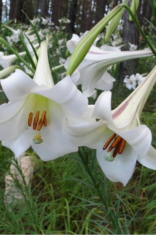An exquisite, quite rare subtropical lily from the Philippines, this one resembles an Easter Lily on steroids, but that blooms in late summer! Long drooping buds atop tall leafy stems open into absolutely beautiful and sweetly fragrant flared white trumpets with green throats up to 8 inches in length. The fragrance is magnificent! You can expect a cluster of up to 6 flowers per stem. Leave the spent flower stalks in the garden for winter interest.