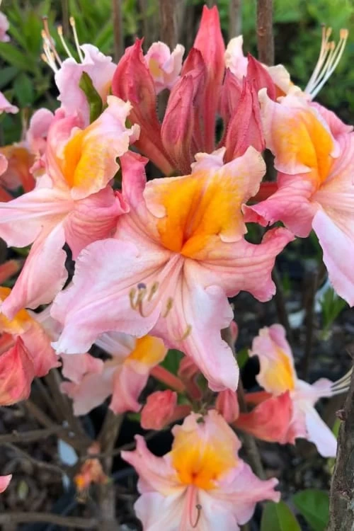With extremely showy multicolor flowers that light up and fill the garden with a wonderful spicy aroma, the Pink Carousel Aromi Azalea is a deciduous hybrid rhododendron that produces abundant clusters of red buds that open to soft pink flowers with wavy petals and a prominent golden blotch on the upper petal. Beautiful! Heat and humidity tolerance, vigor, fragrance, and unique color all come together for an absolutely stunning color display and delicious aroma in the spring garden!