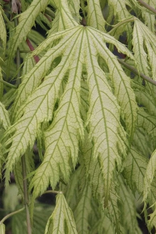 An absolutely lovely small tree that never goes unnoticed by visitors to our gardens during spring, summer and fall, the Sister Ghost Japanese Maple literally glows in the garden. In spring, the delicate, heavily dissected leaves emerge near-white with web-like green veining, appearing as little ghosts at the twig tips. As the season progresses the leaves turn to more of a glowing soft green and then to lime to medium green during summer with dark green veining. Cooler temperatures in fall bring glorious shades of yellow and/or orange and coral. Foliage color is best on Sister Ghost in a location where she is sheltered from direct afternoon sunlight. Morning sun with afternoon shade or all-day filtered sun or dappled shade is fine.